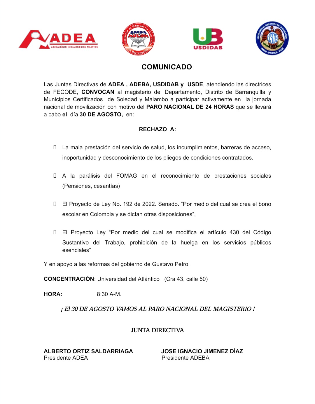 Las Juntas Directivas de ADEA , ADEBA, USDIDAB y USDE, atendiendo las directrices de FECODE, CONVOCAN al magisterio del Departamento, Distrito de Barranquilla y Municipios Certificados de Soledad y Malambo a participar activamente en la jornada nacional de movilización con motivo del PARO NACIONAL DE 24 HORAS que se llevará a cabo el día 30 DE AGOSTO, en: